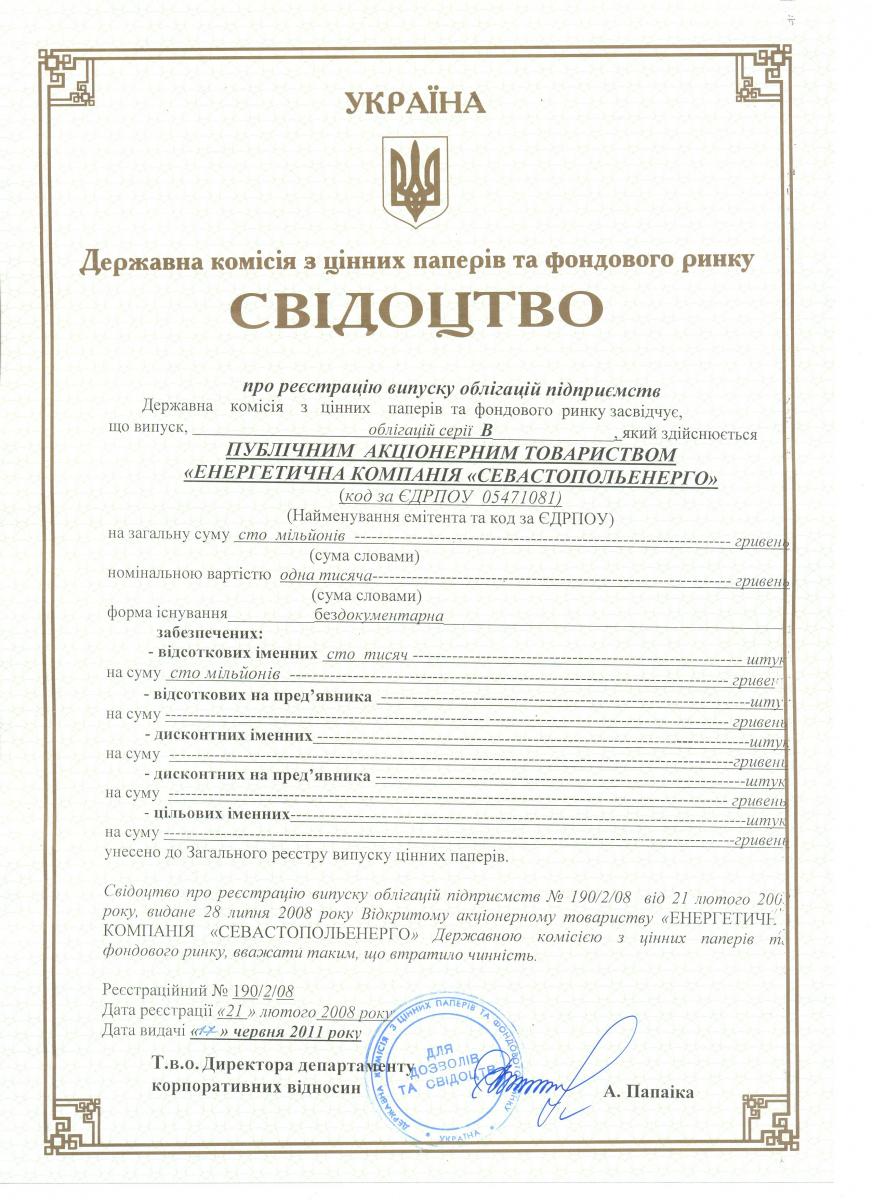 Свідоцтво про реєстрацію випуску облігацій серії В
